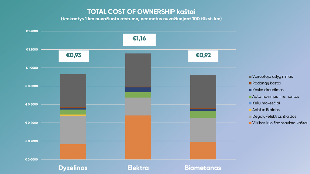 Lietuvos atsinaujinančių išteklių energetikos konfederacija (LAIEK) atliko sunkiojo transporto visuminių transporto išlaidų analizę (angl. total cost of ownership, TCO), kuri parodė, kad dyzelinas jau nėra pigiausia degalų rūšis sunkiasvoriam transportui.
